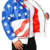 American Flag Jacket is a very uniquely styled jacket. It stylishly expresses your love for America. It comes in a bright white, red, and blue color combination. The apparel has a shirt style collar and full sleeves with elastic cuffs. It has a front zipper closure style with an elastic waistline. Two waist and internal pockets are also there for your ease. The inside is lined with a soft viscose lining providing you comfort at all times.