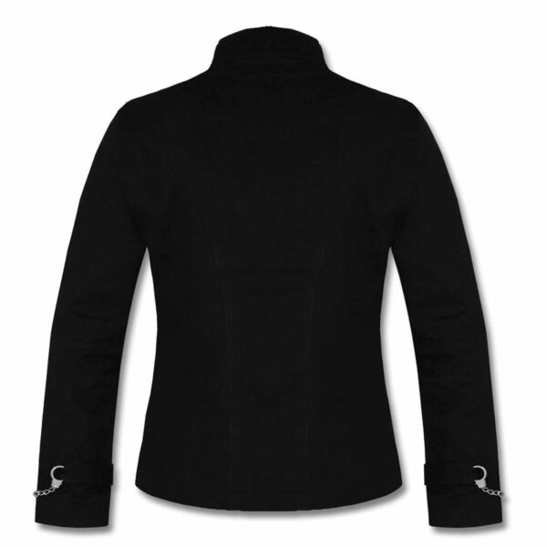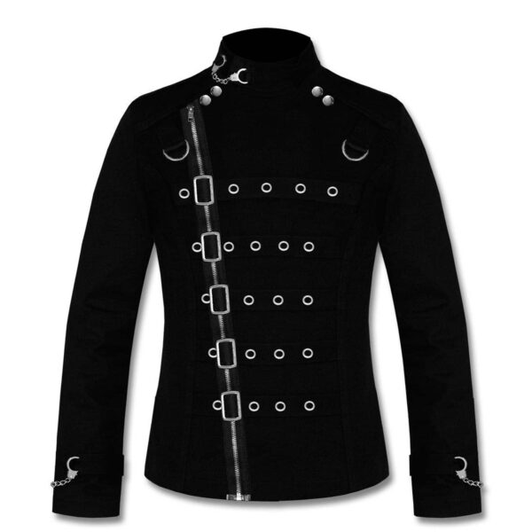 The Black Asylum Goth Vampire Jacket is a great goth jacket with a bunch of buckles and straps. This jacket features two fastening methods, one is with zipper and the second one is with buckles attached with straps. It features five straps on the front with buckles and chrome decorations. It also features a small decorative chrome chain on the collar of the jacket.
