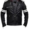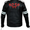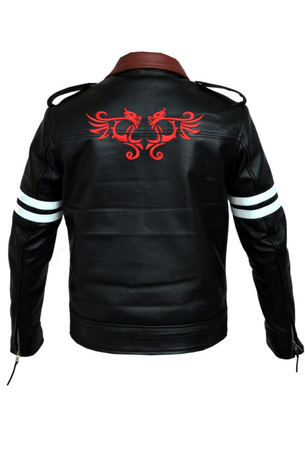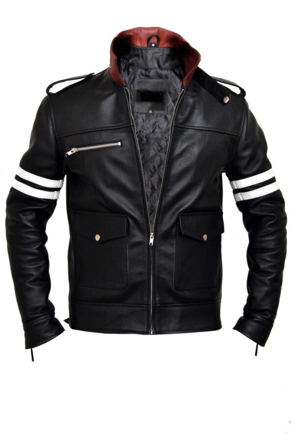 The Prototype Jacket has a shirt style red collar, white stripes on sleeves and three front pockets. Shop for the black biker leather jacket here!     ( Free Gift With Every Order )